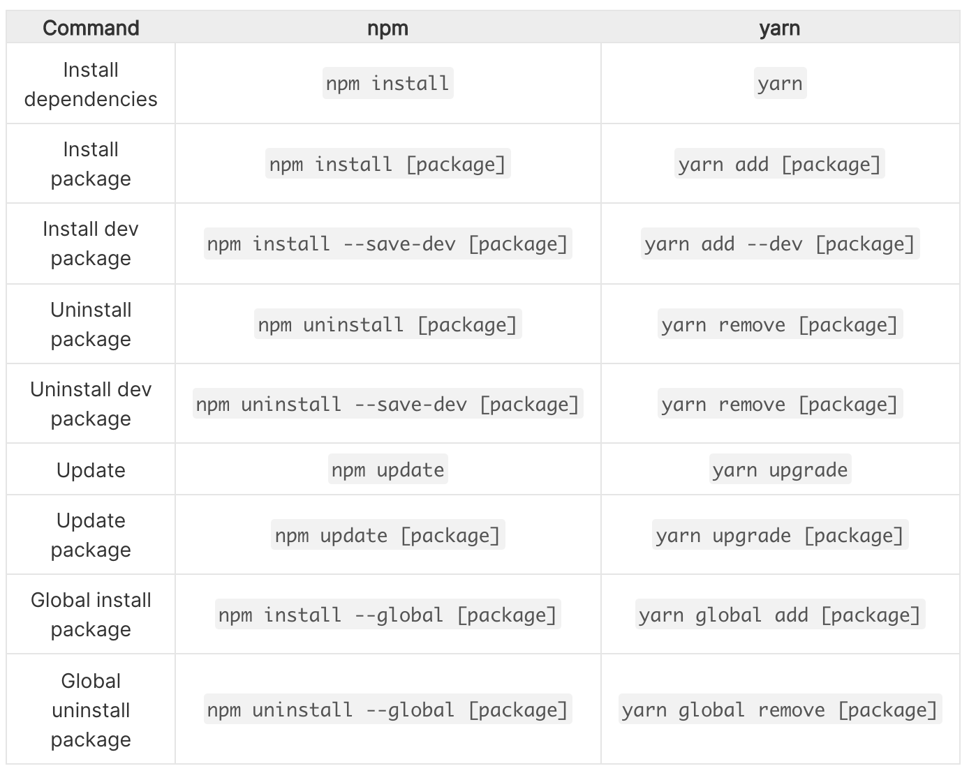 아래 명령어들에 대해서는 yarn이 npm 명령어를 그대로 수용하기로 결정한 명령어들이다.