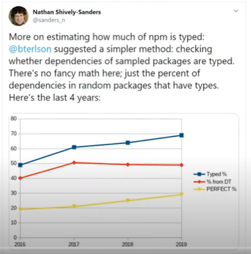 4년 동안 타입 의존성 있는 npm 패키지들은 점차 증가해서 70퍼센트에 이르렀다. 이는 타입 스크립트의 영향이 크다.