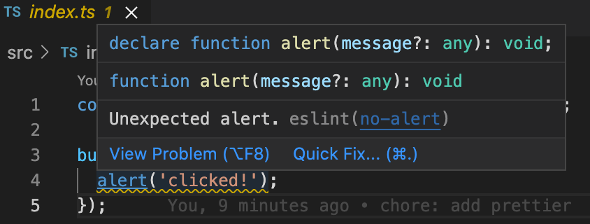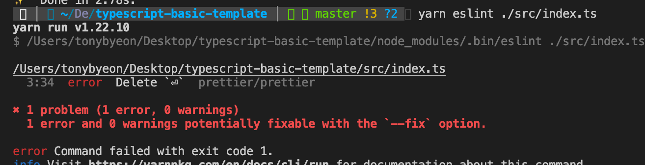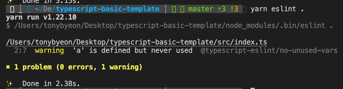 index.ts 파일을 보자. eslint가 잘 적용되었음을 알 수 있다.