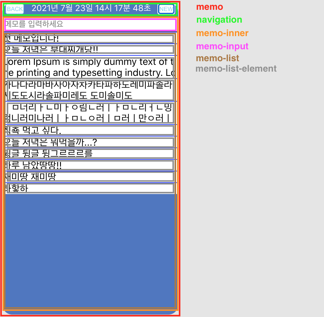 memo는 메모 화면의 최상위 태그이다. 메모 화면의 navigation에는 BACK과 NEW 버튼이 존재한다. BACK 버튼은 누르면 홈 화면으로 이동한다. NEW 버튼을 누르면 memo-input이 렌더링 된다. memo-input 을 통해 메모를 추가할 수 있으며, 추가된 메모는 memo-list에 렌더링 된다. 메모는 2줄까지만 표시되며, memo-list-element를 누르면 전체 메모가 렌더링 된다.