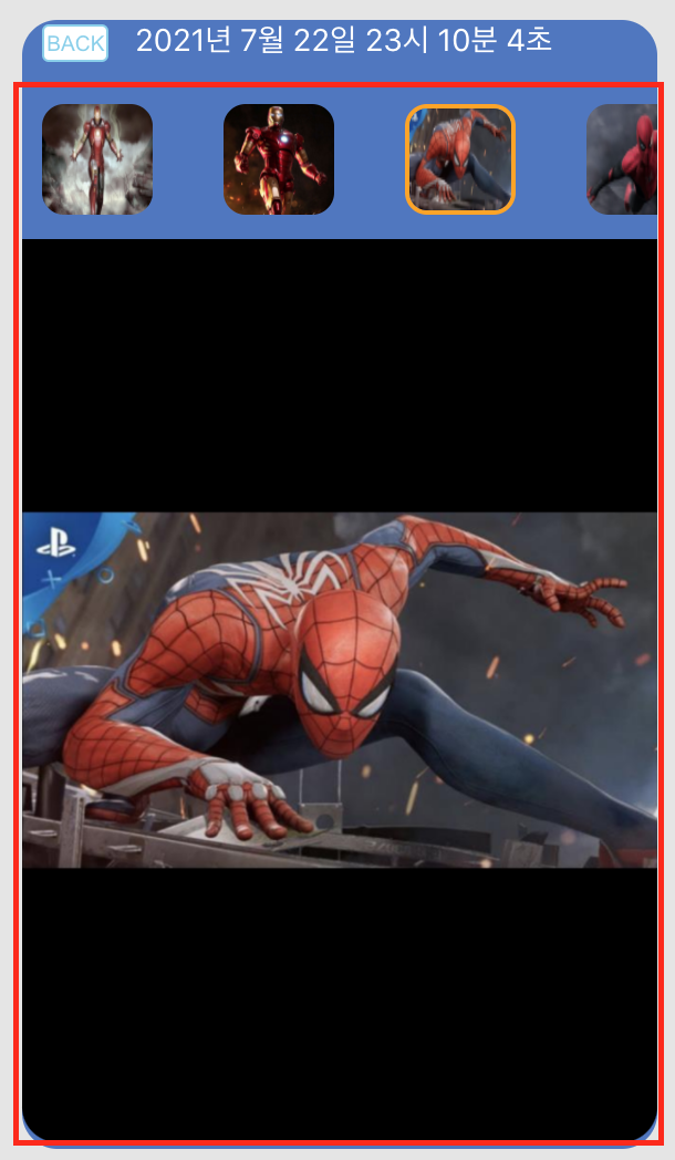 사진 화면에는 가로 스크롤로 저장된 사진들을 볼 수 있으며, 스크롤에 있는 사진을 클릭하면 화면에 알맞은 비율로 사진이 아래에 렌더링 된다.