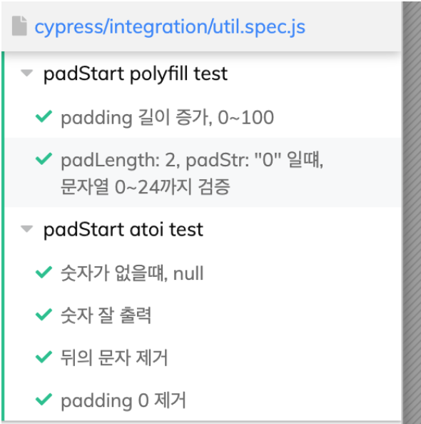 padStart 메소드가 es2017 버전부터 추가되어서, es6에는 존재하지 않는다. 따라서, 시간 측정에 알맞은 padStart를 만들고 테스트 코드로 검증했다.