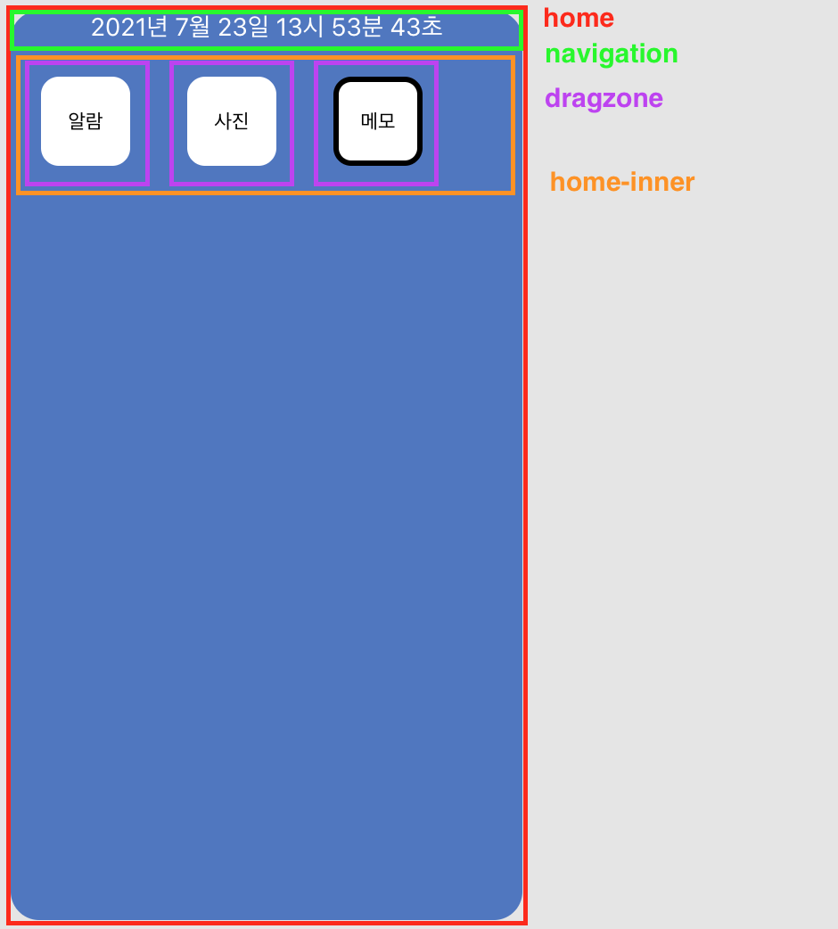 각각의 화면에 대해 기능 별로 구역을 나눠서 구현을 했다. home은 root 태그 안에 추가되며, 홈 화면의 최상위 태그이다. 각 앱별로 navigation의 구성요소가 달라져서 navigation을 home 내부 요소에 포함시켰다. home-inner는 실제 home의 content가 들어가는 공간이다. dragzone은 dragzone안의 draggable="true"인 앱들에 대해 드래그 할 수 있는 구역이다. navigation은 각 앱 상단에 위치하며, 현재 시간에 맞게 갱신된다.