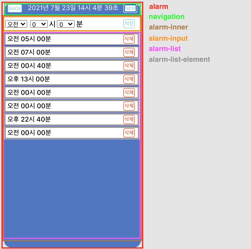 alarm은 알람 화면의 최상위 태그이다. 알람 화면의 navigation에는 BACK과 NEW 버튼이 존재한다. BACK 버튼은 누르면 홈 화면으로 이동한다. NEW 버튼을 누르면 alarm-input이 렌더링 된다. alarm-input을 통해 알람을 등록할 수 있으며, 등록된 알람은 alarm-list에 렌더링 된다. alarm-list-element의 삭제 버튼을 누르면, 해당 알림이 삭제된다. 등록된 알람은 navigation 의 현재 시각을 기준으로 해당 시간이 되면 alert 창으로 알림을 알려준다.