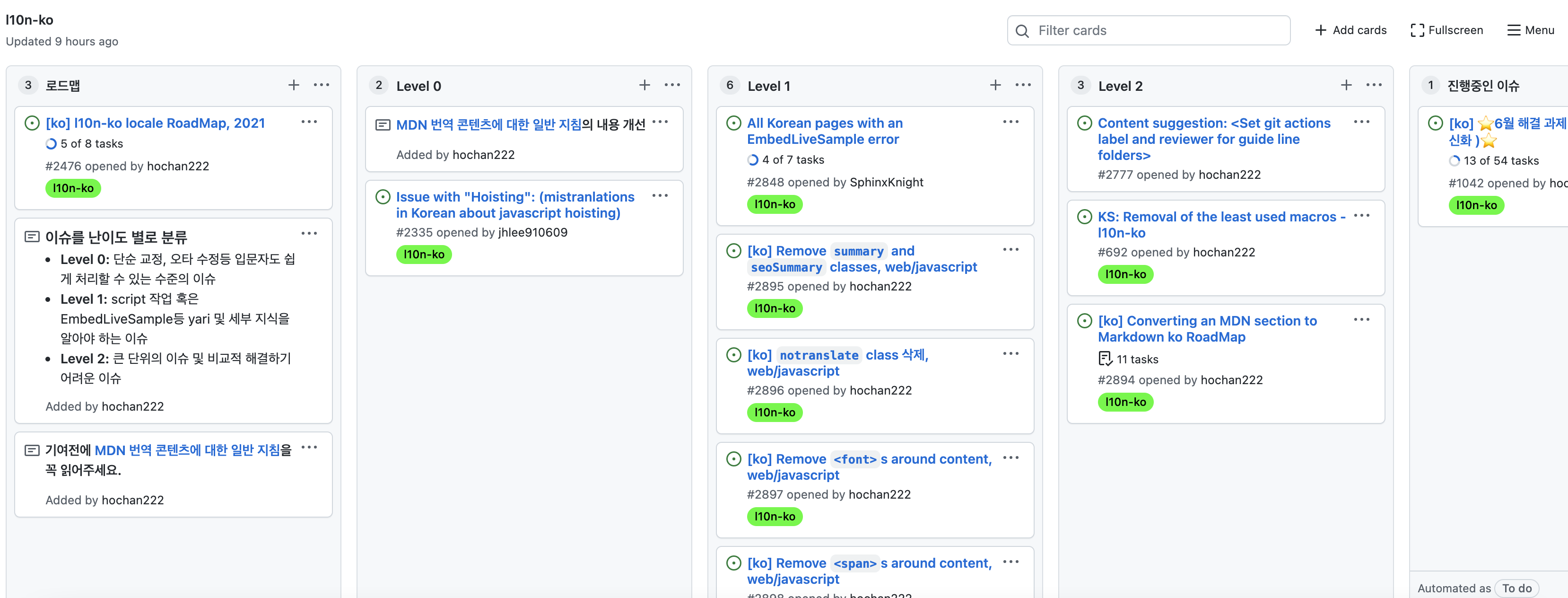 기여에 가장 큰 걸림돌은 자신의 지식에 맞는 문제가 무엇인지 파악하지 못하는 점입니다. 무엇을 기여해야할지 모르겠다면 현황판으로 시작할 수 있습니다. Level 0, Level 1, Level 2 MDN의 이해도에 맞게 이슈를 처리할 수 있습니다. 등록된 이슈들은 yari-content-ko 팀이 주기적으로 이슈를 모니터링해서 난이도 별로 분류할 예정입니다.