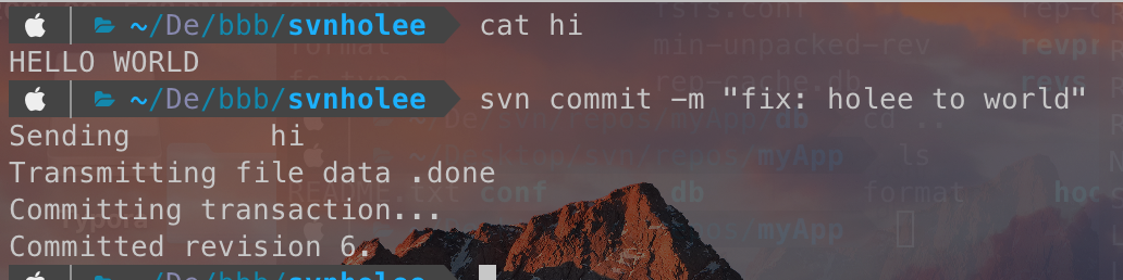 한편 다른쪽에서 똑같이 레파지토리를 checkout 한 폴더에서 hi 파일을 HELLO WORLD로 변경하고 commit을한다. 이때 revision은 6이다. (중간에 한번 더 commit 해서 6이 되었다.)