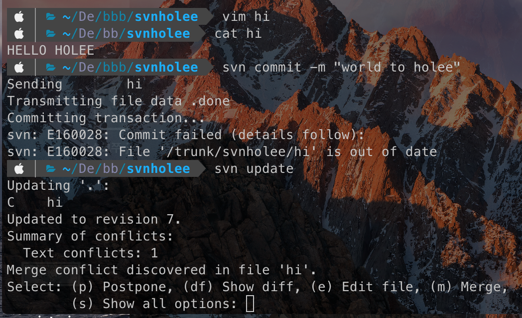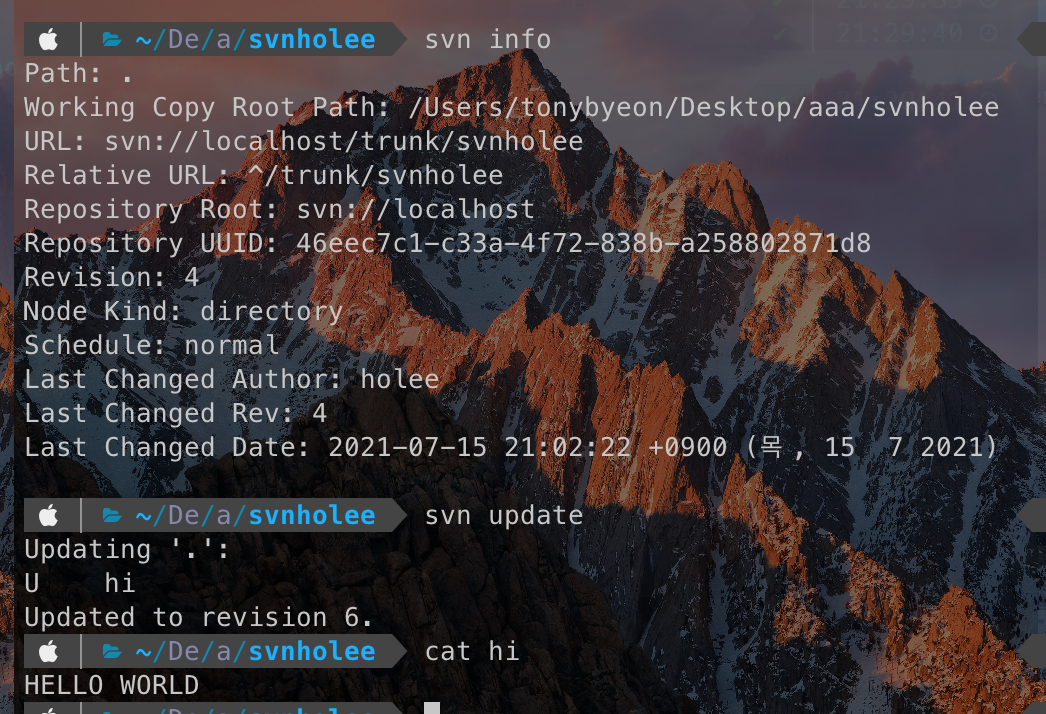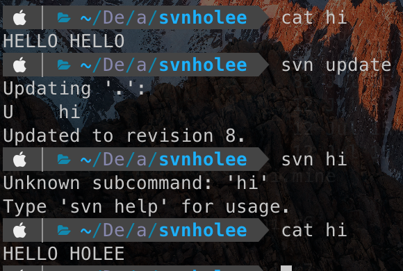 svnholee 폴더에 hi 파일이 있다. hi 파일은 HELLO HOLEE 문자열이 들어있다. 이때 revision은 4이다.