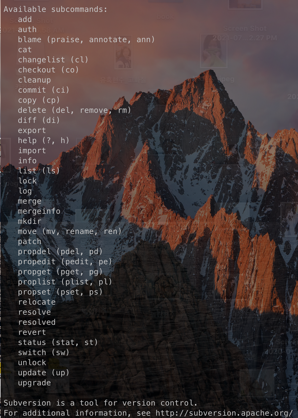 svn 명령어에 어떤것들이 있는지는 svn help, svn help <명령어> 로 확인 할 수 있다. svn에는 총 37 가지 명령어들이 존재한다.