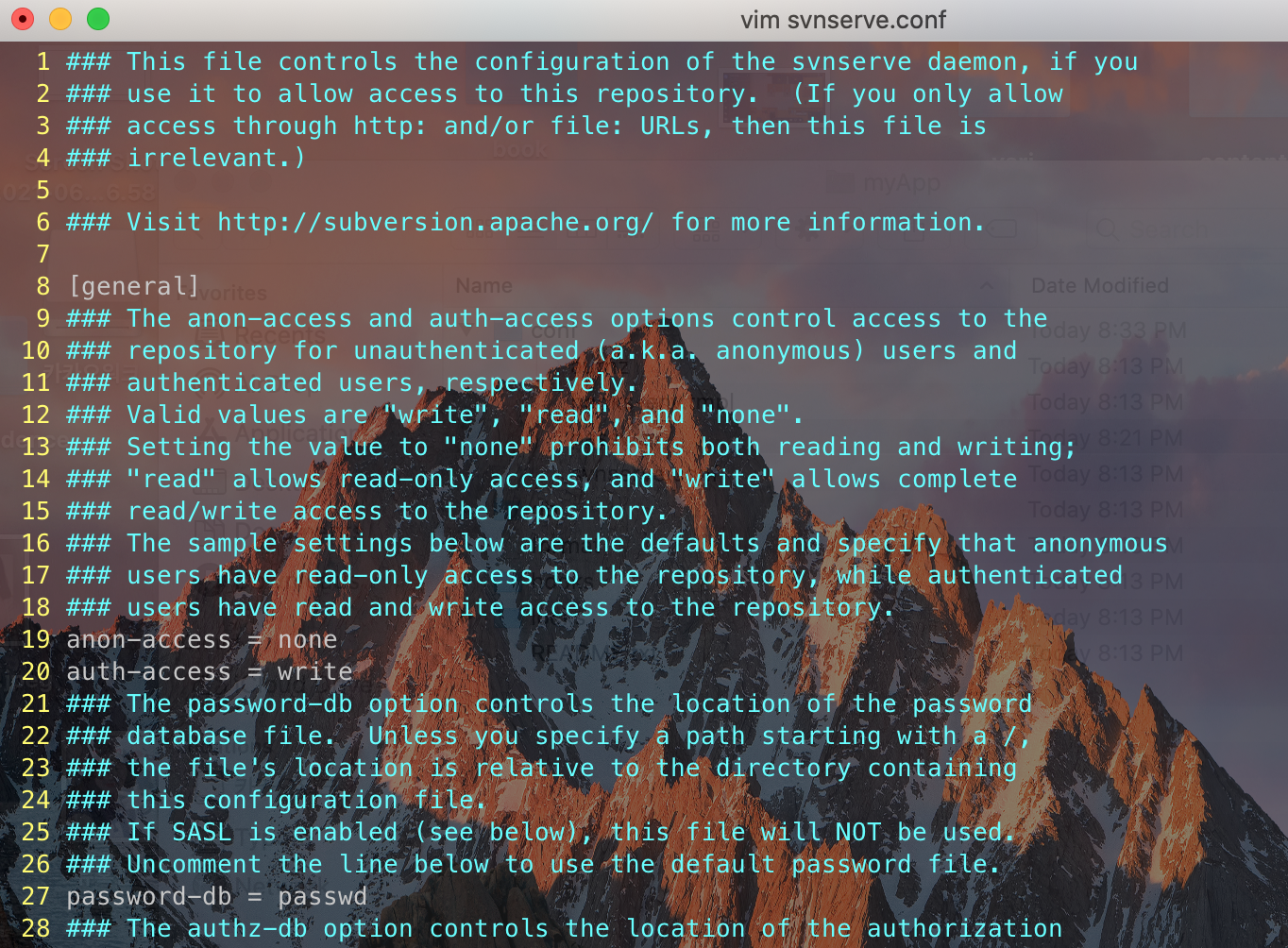 /conf/svnserve.conf 파일을 수정해서 권한들을 설절 할 수 있다. 우선, 기본적인 세 가지만 설정해보자.