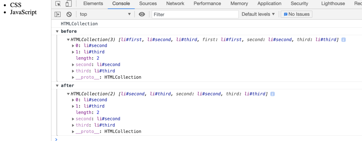 - document.getElementsByTagName의 반환 값: HTMLCollection